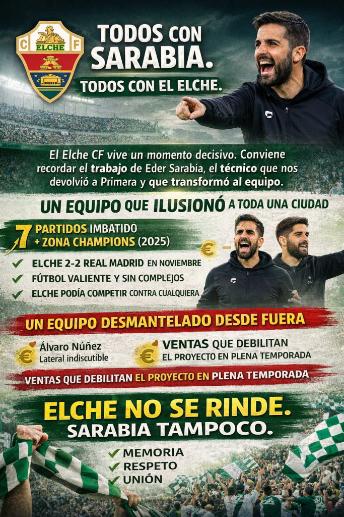 Porque Sarabia ha demostrado nivel, carácter y un compromiso absoluto. Porque ha hecho competir al Elche como hacía décadas que no veíamos. Porque su éxito es el nuestro. Y porque esta afición, que lo ha dado todo, merece un proyecto que no se rompa desde dentro.