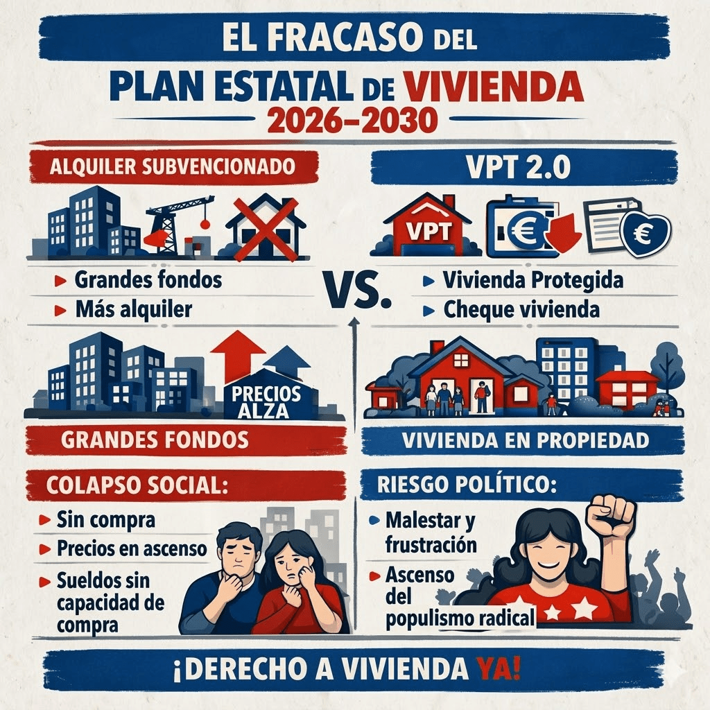 El Plan 2026-2030 se presenta como el primero bajo una ley estatal de vivienda, pero su estructura es la misma que la de los planes anteriores: centralización, cofinanciación y dependencia de grandes operadores. La supuesta calificación permanente de las viviendas protegidas no compensa la falta de acceso a la propiedad. La vivienda pública destinada al alquiler durante 50 años no es una solución estructural, sino una prórroga del problema.