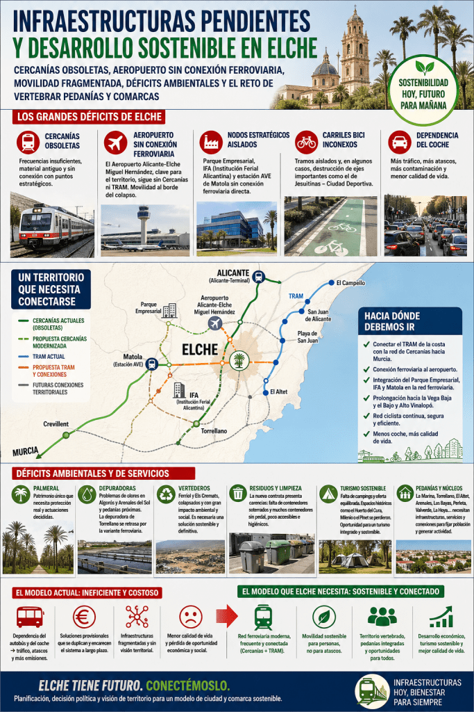 Elche se encuentra ante un momento decisivo en materia de infraestructuras y modelo territorial. El reciente debate abierto en torno a las infraestructuras pendientes vuelve a poner sobre la mesa una realidad que ya no puede aplazarse: no se trata solo de ejecutar proyectos aislados, sino de definir con claridad qué modelo de ciudad y de territorio queremos construir desde la sostenibilidad, la eficiencia y la cohesión.