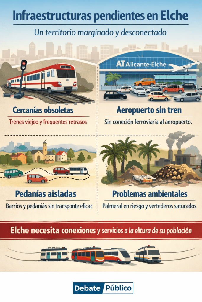Elche afronta un momento decisivo. Tras décadas de crecimiento económico, demográfico y urbano, la ciudad continúa arrastrando un déficit estructural en infraestructuras que condiciona su competitividad, su sostenibilidad y la calidad de vida de su ciudadanía. El debate sobre las infraestructuras pendientes no es nuevo, pero hoy adquiere una urgencia mayor: no basta con ejecutar proyectos sueltos; es imprescindible definir un modelo territorial coherente, moderno y sostenible.